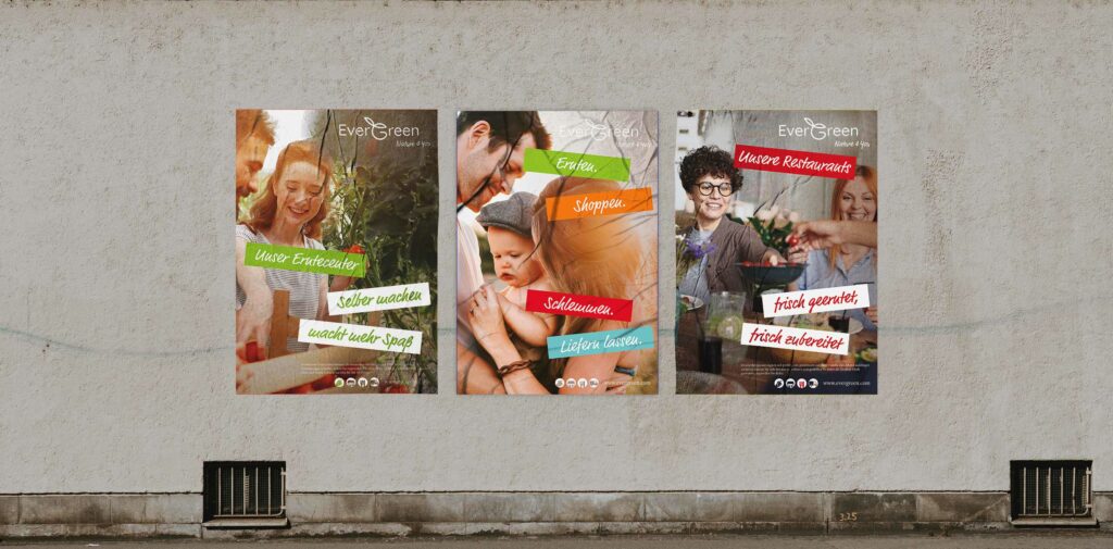 Die Hauptfarbe der Marke ist ein helles Grün, das Natur, Frische und Nachhaltigkeit symbolisiert. Da EverGreen aus vier eigenständigen Geschäftsbereichen besteht, wurde jedem Bereich zusätzlich eine eigene Akzentfarbe zugeordnet. Dieses Farbsystem ermöglicht eine klare Differenzierung, ohne die visuelle Klammer der Marke aufzulösen.