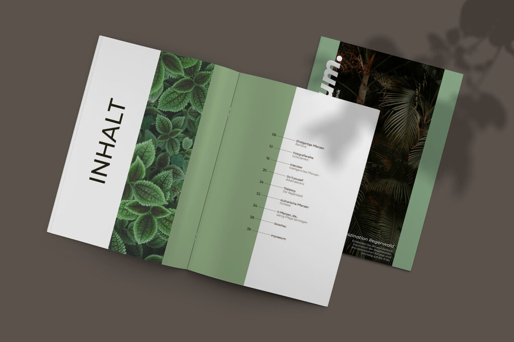 „folium“ ist ein Magazin, das sich thematisch mit Pflanzen und Botanik auseinandersetzt. Jede Ausgabe widmet sich neuen Inhalten aus unterschiedlichen Bereichen und Unterkategorien, die jedoch einer wiederkehrenden Struktur und Systematik folgen.