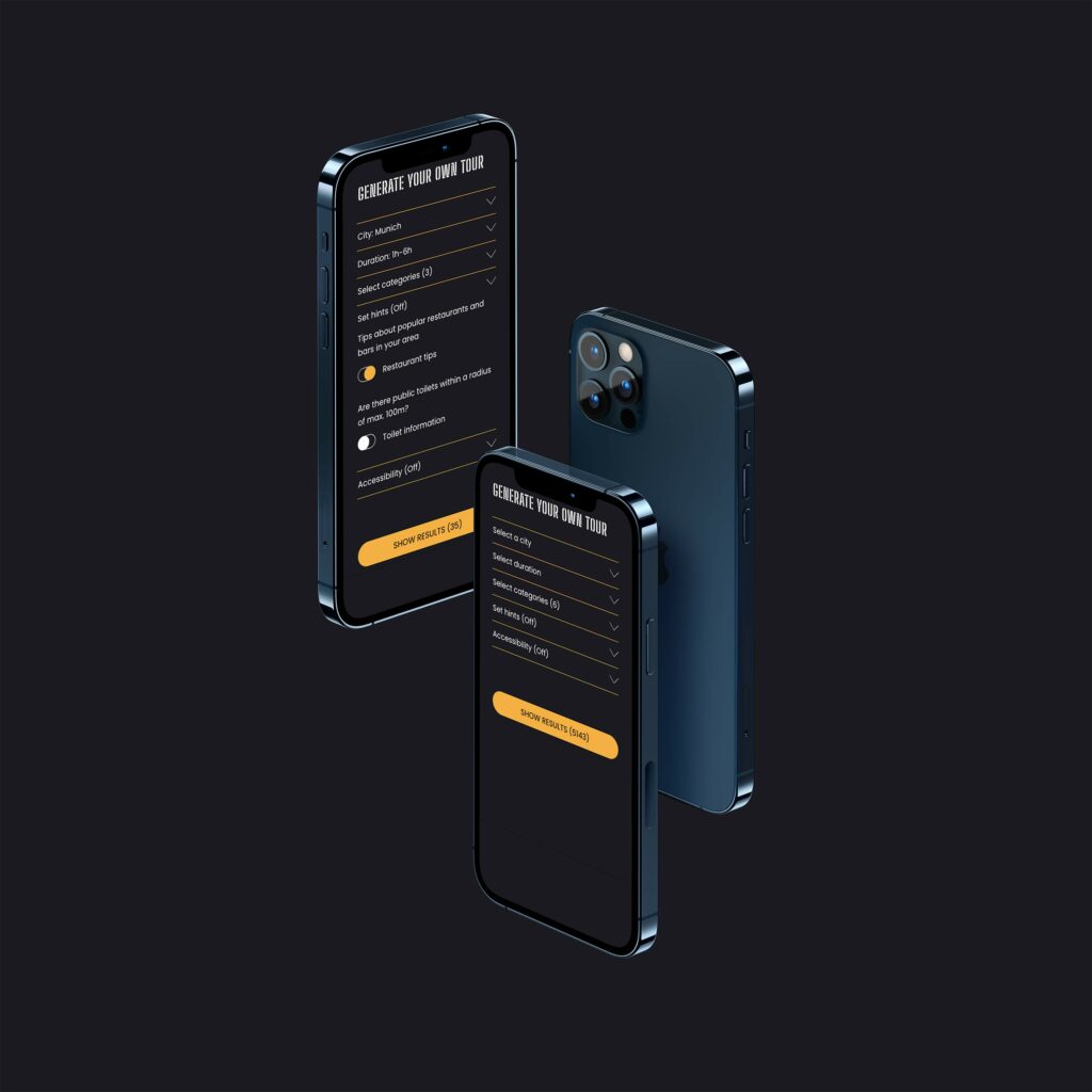 Als zentrales Feature können Nutzer:innen individuelle Touren erstellen. Dafür werden Attribute wie Ort, Dauer, Kategorien und Barrierefreiheit ausgewählt. Auf Basis dieser Angaben generiert die App mit minimalem Aufwand eine passende Route.